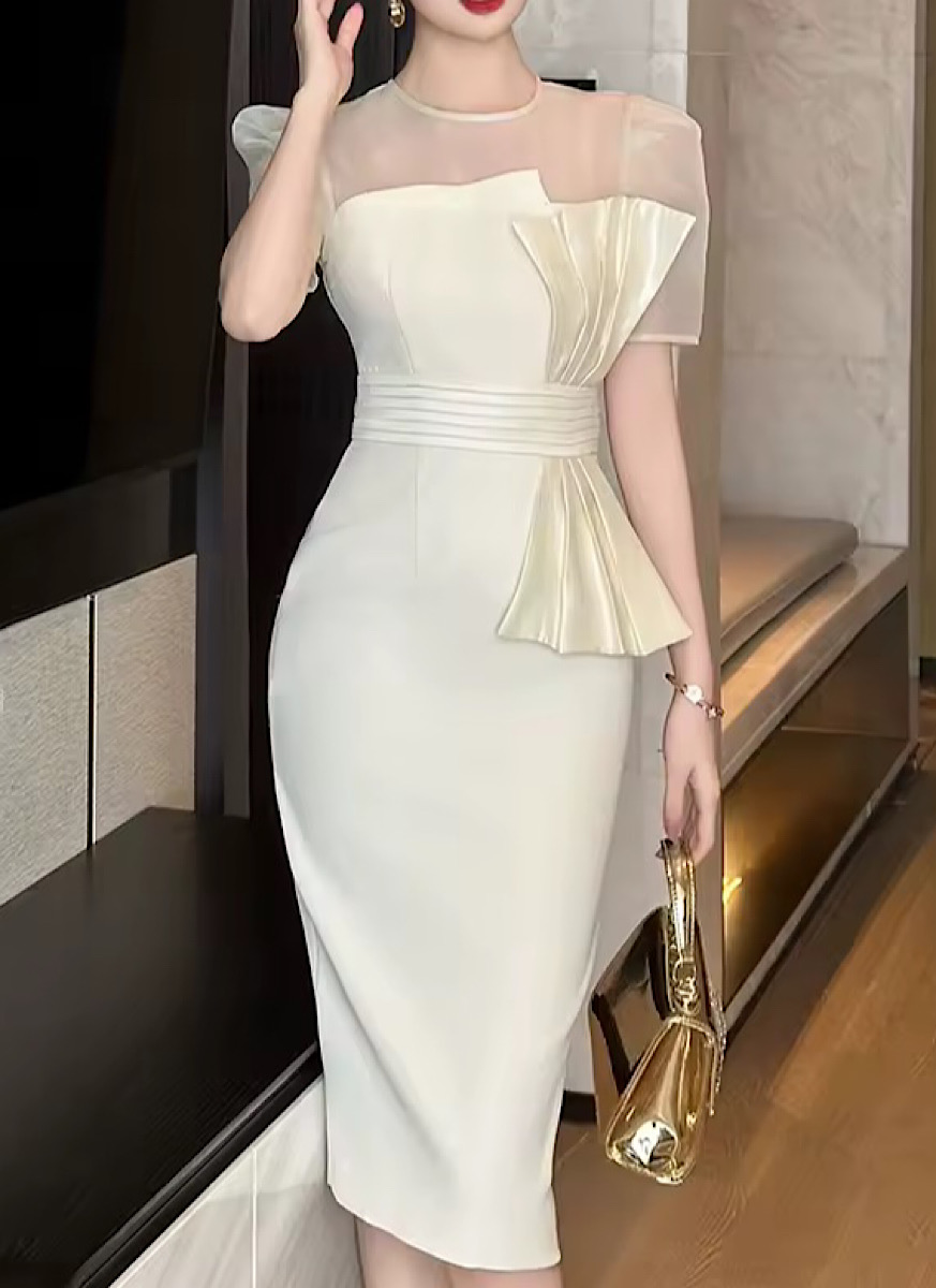 Vestido midi elegante color crema con detalle de moño en cintura y transparencias.